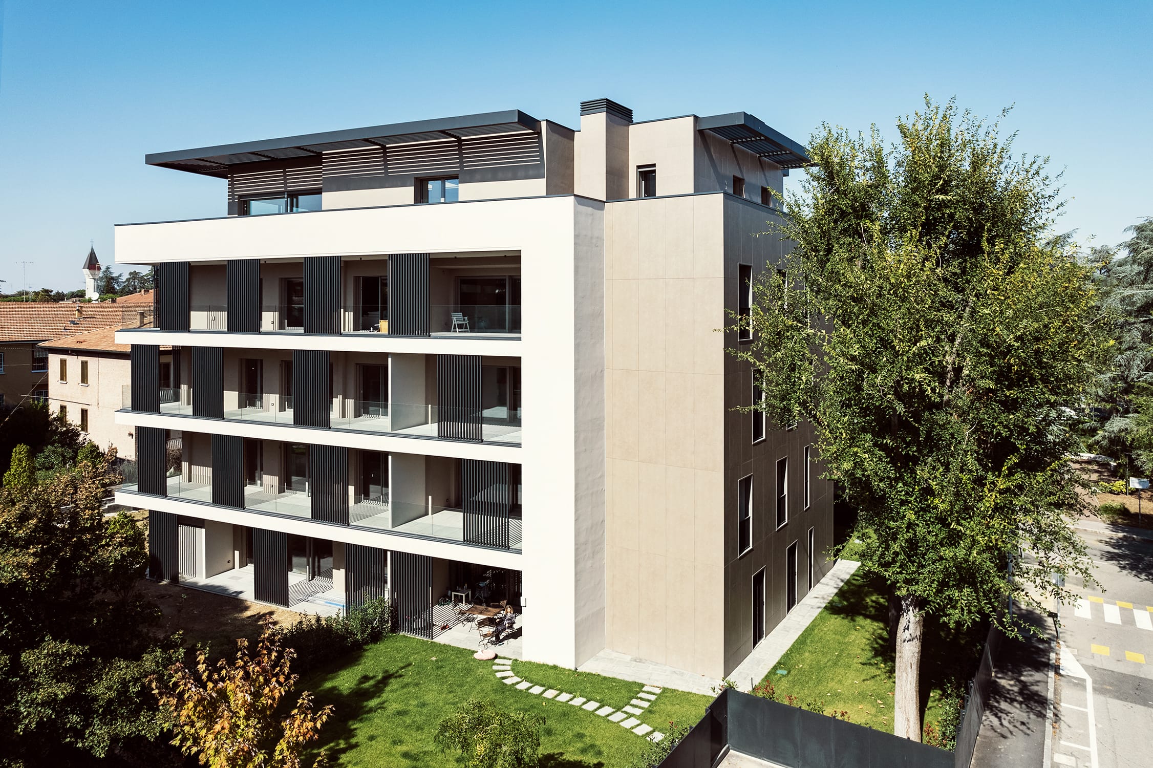 Le soluzioni costruttive adottate, l’isolamento performante e l’integrazione di sistemi passivi per il controllo della luce e del calore garantiscono comfort abitativo e riduzione dei consumi. Le schermature verticali diventano elementi architettonici che regolano l’irraggiamento solare, migliorando le prestazioni complessive dell’edificio e valorizzando la relazione tra interno ed esterno. Il nuovo complesso residenziale non solo si qualifica come un edificio ad alte prestazioni, ma diventa anche un tassello importante nel territorio urbanizzato restituendo alla città un volume rigenerato, sostenibile e in armonia con il contesto.